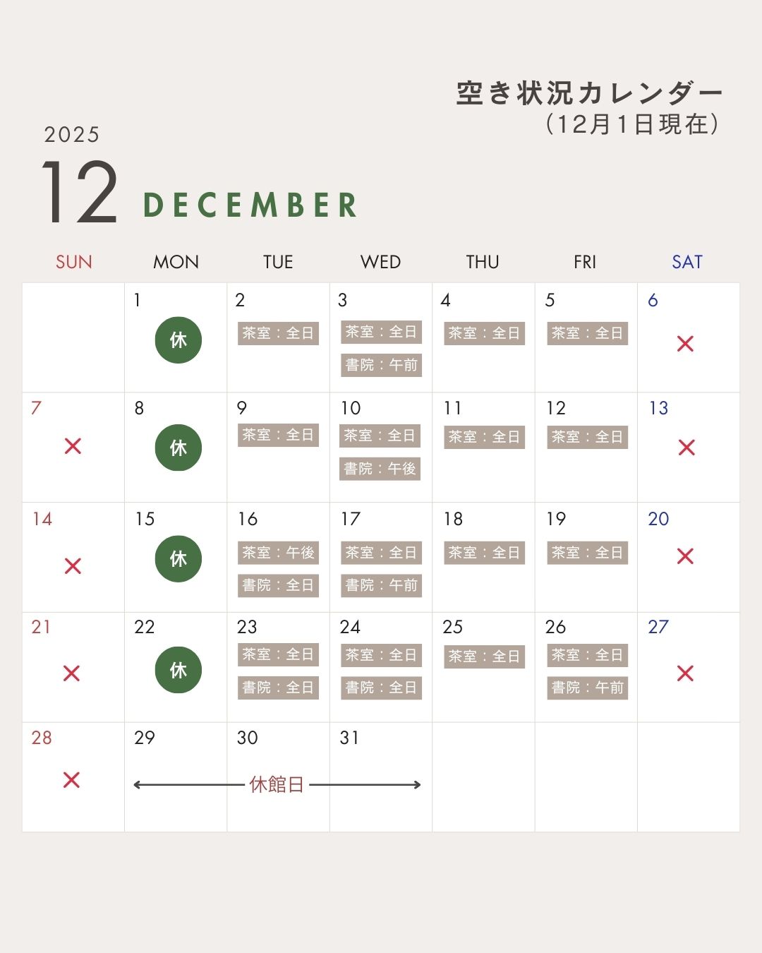 令和7年 12月 →空き状況カレンダー